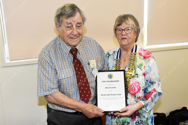 Healesville Probus Club’s Ron Crowley was presented with a life membership by his wife and president, Trish Crowley. (510439)