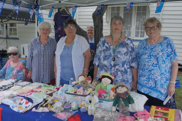 Proston CWA ladies members Lyn Reynolds, Val Klein, Margaret Christie, Eileen Vos, Judith Marek and Mellissa Dunn at the back behind the tree with their market stall. 385735_06