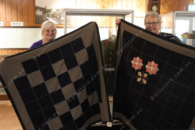 President Libby Anderson and vice president Annette Stone hold two traditional wagga quilts. (514641)