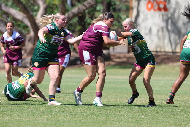 North Rockhampton’s Melody James bursts through a two-player tackle from Emerald.