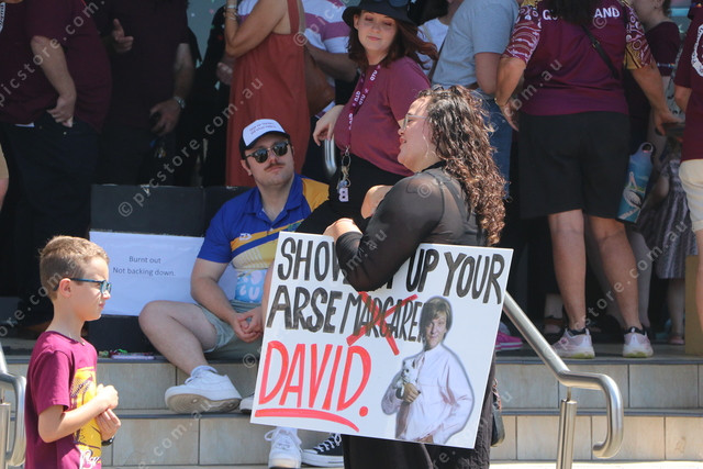 The region’s educators created incisive placards targeting the Queensland Government’s perceived inaction in the bargaining process. (Julian Lehnert: 520102_02)