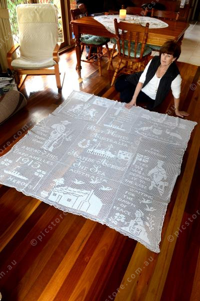 take pics of Babara. She is the great granddaughter of a mum who knitted five quilts after her sons left for war. She has one that is in mint condition. Get pics of her wrapped up in it, ect.