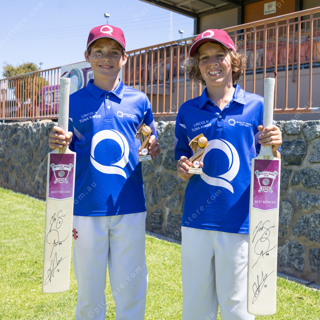 Best fielder Cooper Meyers and best bowler Solly Simpson, both from Port Lincoln Tuna Kings, pictured with their signed bats. (Mitchell Paterson: 528270_21)
