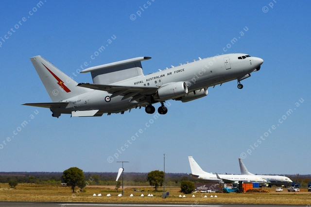 WEDGIE: An RAAF Wedgetail flies past ex RAAF VIP aircraft park at the APAS site as it departs Alice Springs. (PIC: PHIL WILLIAMS 498243_01)