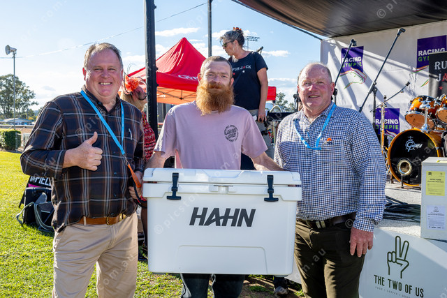 Jake Dillon Mills was the lucky esky winner, pictured with Turf Club vice president Eric Sprott and Turf Club president Shane Gill.
