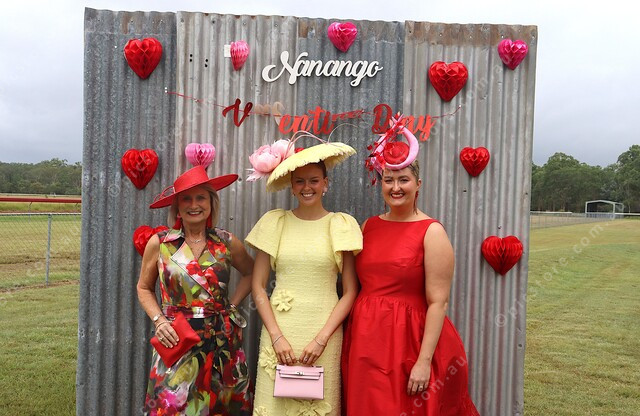 Neva Hallam, Tess Schiffmann and Julie Cardiff rock their outfits at Nanango Races. 534830_02