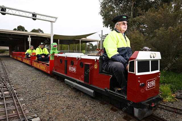 Bulla Railway Open Day. Pic of train driver Geoff Hayday and the other members of the club on one of the trains. Photo by Damjan Janevski. 487838_02