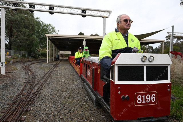 Bulla Railway Open Day. Pic of train driver Geoff Hayday and the other members of the club on one of the trains. Photo by Damjan Janevski. 487838_04