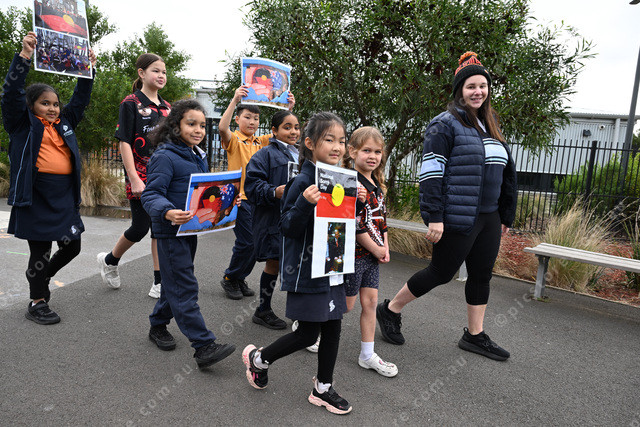 Saltwater P-9 College, Point Cook, Reconciliation Week. Pic of teacher Steph Fatouros with students: Amiyah, Paityn, Rinad, Arya, Austin, Chloe and Shona. Photo by Damjan Janevski. 479794_01