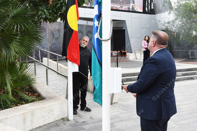 Stewart Taylor Victoria Police Southern Metro Region Aboriginal Liaison Officer raising the flags with Mayor of Greater Dandenong Jim Memeti 479828_26