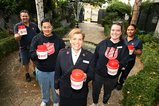 Werribee Salvos want people to get on board for the Red Shield Appeal. Pic of (L-R): Major Phill Abram, Rosita Faatau, Major Catherine Abram, Tara Abram and Pola Oscar. Photo by Damjan Janevski. 471240_03