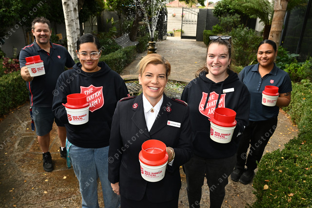 Werribee Salvos want people to get on board for the Red Shield Appeal. Pic of (L-R): Major Phill Abram, Rosita Faatau, Major Catherine Abram, Tara Abram and Pola Oscar. Photo by Damjan Janevski. 471240_05