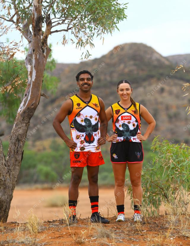 WEST MACS: Red and Pink tails players, Shaydan Close and Lara Harding with West MacDonnell Ranges behind. PIC: PHIL WILLIAMS 393899_04