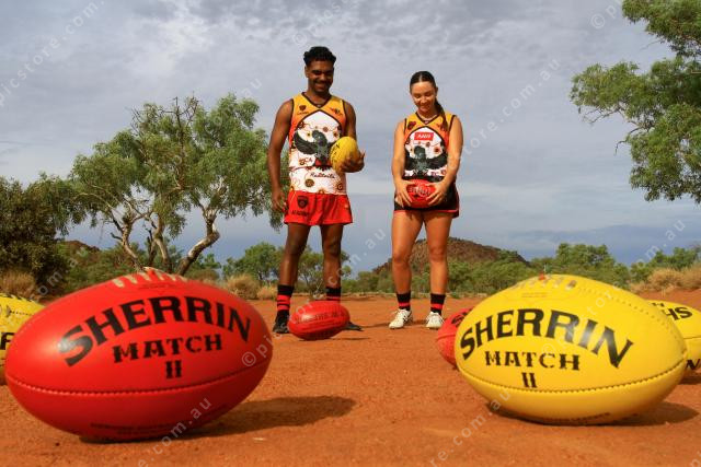 FOOTY: Red and Pink tails players, Shaydan Close and Lara Harding with the red desert landscape . PIC: PHIL WILLIAMS 393899_09