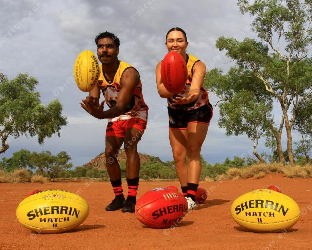 ALICE SPRINGS: Red and Pink tails players, Shaydan Close and Lara Harding at the Ilparpa Claypans. PIC: PHIL WILLIAMS 393899_13