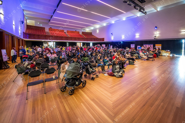 Wide shot of the area in front of the stage with the stalls at the rear.