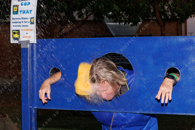 A member of the Barossa Blues takes a hit for a wet sponge for charity. 469109_43