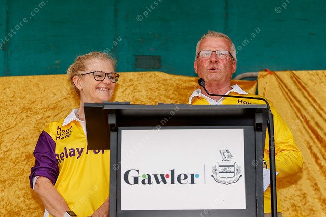 Rosie Tearle and Richard Holt read out the names of survivors and carers, inviting them to join together on the track for the first lap. 469109_74