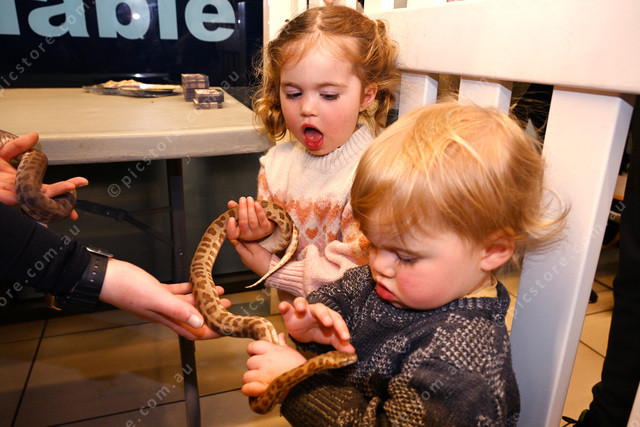 School holidays event at Sunshine Plaza, reptile show. Pic of Kyra (3) and Frankie (1). (Damjan Janevski). 506813_02