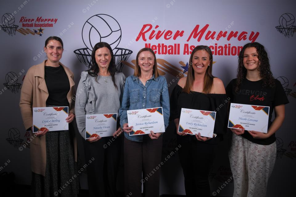 Crystal Berling, Imperials; Natasha Vivian, Mannum; Jessica Richardson, Coorong Cats; Emily Richardson, Coorong Cats and Nicole Cercone, Jervois were celebrated for playing 150 games.