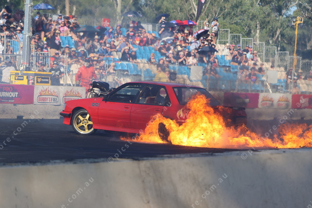 Tasmania’s Darren Triffett and INJECTED catch fire on the burnout pad on Sunday during the Pro Class Final.