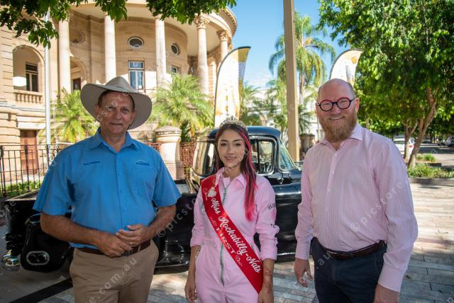 Mayor Tony Williams, Miss RockabillyNats 2022 Mercury Lien and Advance Rockhampton Executive Manager Greg Bowden at a press conference for RockyNats 03