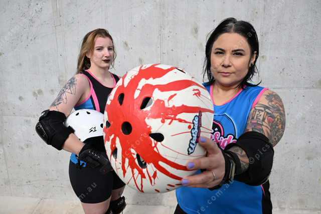 Footscray roller derby. Pic of Jessica Hunt AKA ‘Massica Jones’ and Mel Buttigieg AKA ‘Bleeder of the Pack’. Photo by Damjan Janevski. 484215_03