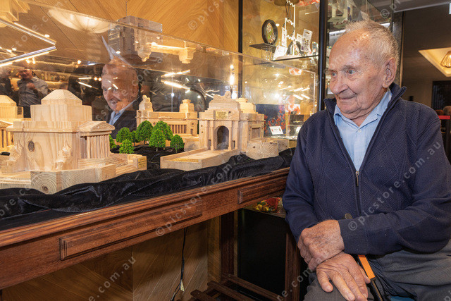 96yo Don Bergman with his carvings at Noble Park RSL Sub-Branch.