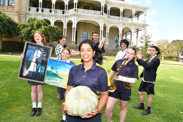 Salesian College Sunbury are preparing to host a community market event called Rupertswood Harvest. Pic of students: Teisha (front), Alice, Allira, Isabel, Ben and Jayden; and teachers Dana Ciceo and Daniel Kavanagn. Photo by Damjan Janevski. 464989_04