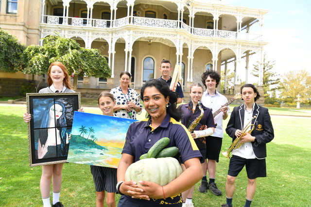 Salesian College Sunbury are preparing to host a community market event called Rupertswood Harvest. Pic of students: Teisha (front), Alice, Allira, Isabel, Ben and Jayden; and teachers Dana Ciceo and Daniel Kavanagn. Photo by Damjan Janevski. 464989_05