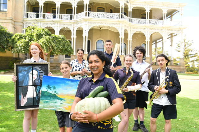 Salesian College Sunbury are preparing to host a community market event called Rupertswood Harvest. Pic of students: Teisha (front), Alice, Allira, Isabel, Ben and Jayden; and teachers Dana Ciceo and Daniel Kavanagn. Photo by Damjan Janevski. 464989_06