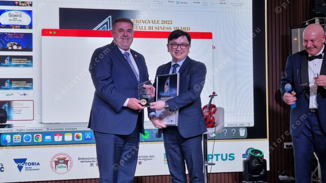 Greater Dandenong mayor Jim Memeti presents House of Wealth managing director Wilson Fung with the Best Professional award. (Cam Lucadou-Wells: 509146)
