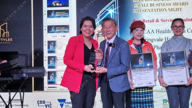 Mulgrave MP Eden Foster presents Best Retail & Service Award to Lim’s Pharmacy owner Richard Lim. (Cam Lucadou-Wells: 509146)