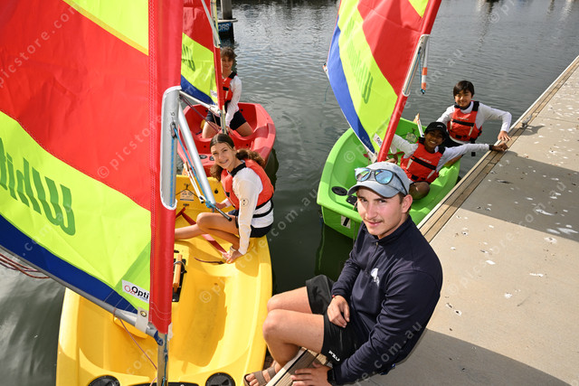 Oscar Henderson runs a sailing school and wants more kids to know about the sport of sailing. Pic of Oscar with his students Maya (12), Bianca (11), Ishaq (13) and Hogan (11). Photo by Damjan Janevski. 470637_02