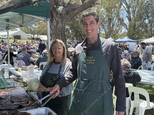Ange Garreffa and principal Troy Westport of Euston Public School fed the masses. Picture: Lochlainn Heley