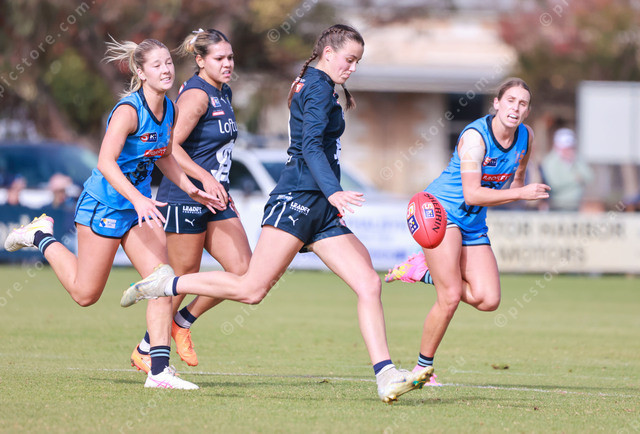 South Adelaide League debutant Molly Jenkins drops the ball onto her boot during her match against Sturt. (Jesse Ehlers: 479025_09)