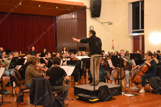QYO’s Simon Hewett conducts the South Burnett Community Orchestra, along with the QYO Wind Symphony members through a rehearsal. (Jessica McGrath: 488019_01)