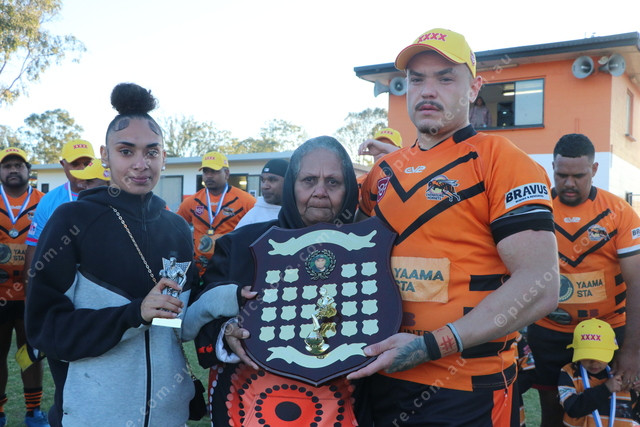 Cherbourg’s Anthony Gray was moved to tears when he received the ‘Chaz’ Williams Memorial Shield. 500593_08