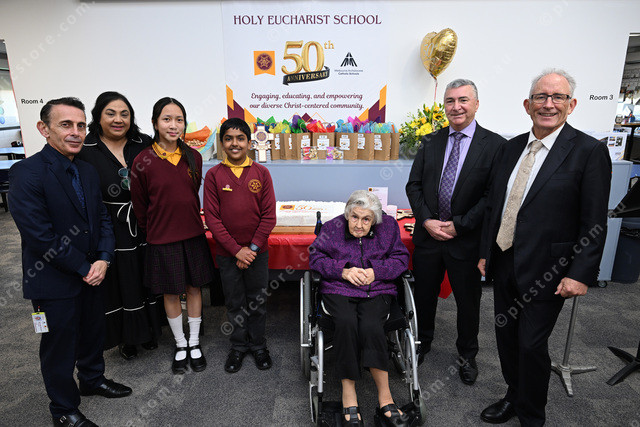 Holy Eucharist School, Stalbans, 50th anniversary. Pic of principal Michael Bonnici, deputy Anne-Marie Conte, school leaders Athena and Andre, and three past principals Sr Leonie Glennen, Jeffrey Parkers and Greg White. (Damjan Janevski). 485007_04