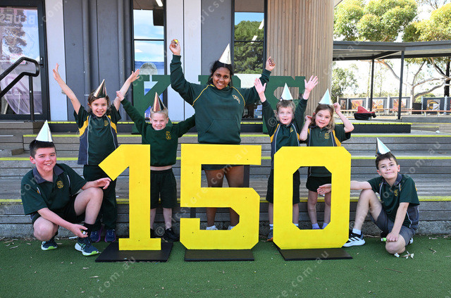 Keilor Primary School festival to mark its 150th anniversary. Pic of students Lincoln, Luna, Jhett, Movinya, Harry, Caitlin and Eden. (Damjan Janevski). 508352_01