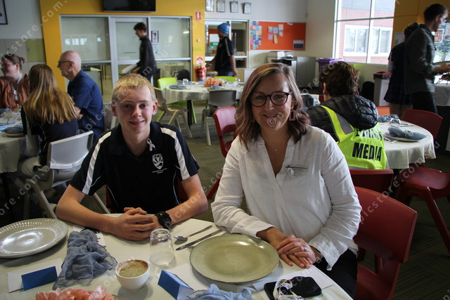 Year 9 student Boyd de Jong and Dircetor of Secondary Education Vanessa Coker at the Eastern Fleurieu School White Ribbon Breakfast. (Dee Elferink: 521098_08)