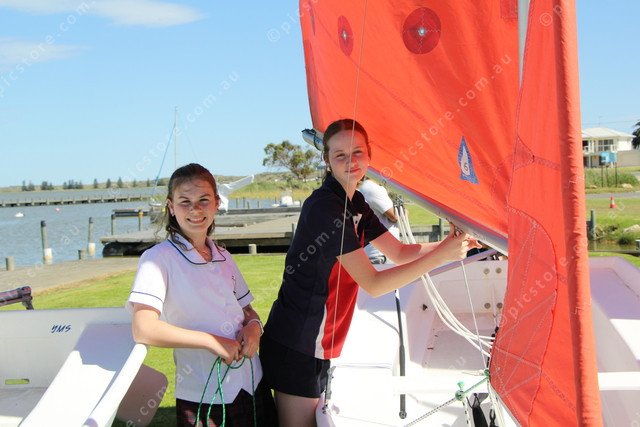 Summer Newman and Ivy Cronin from Encounter Lutheran College getting their pacer ready to sail. (Dee Elferink: 522514_07)