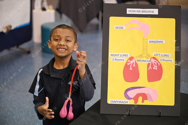 St Monica’s Primary School science fair. Pic of year-1 student Kavin (correct spelling Kavin). Photo by Damjan Janevski. 481310_07