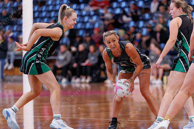 WENA’s Chloe Ettridge intercepts a short pass from BLGNA’s Charlotte Flego to BLGNA’s Amelia Bennett