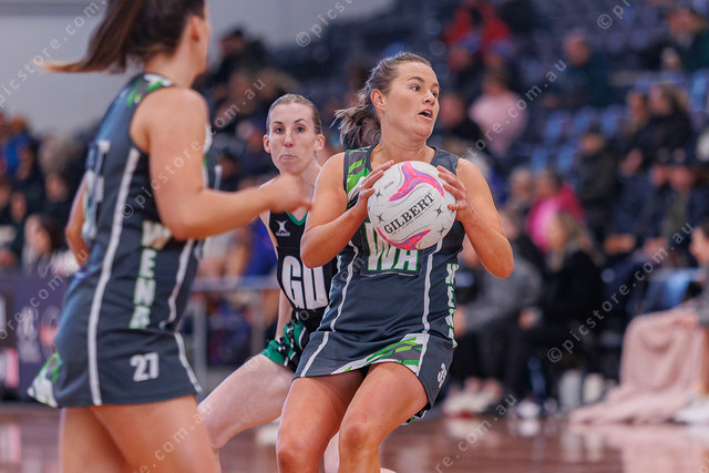 WENA’s Kate Thiele secures a pass ahead of the incoming BLGNA’s Rebecca Higgins