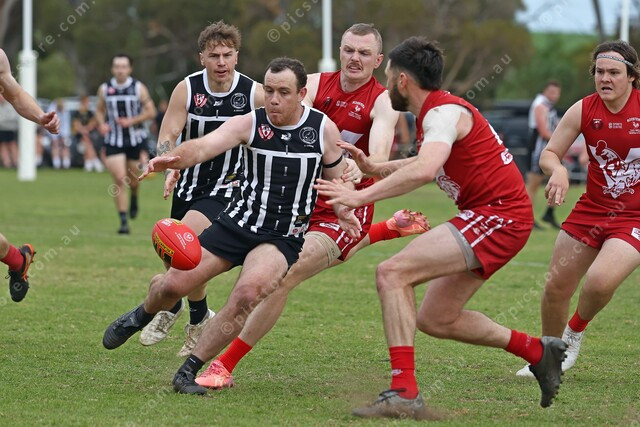 Mallala’s Jake Tiller tries to sneak a delicate squib past Pat Binyon. (501896_05)