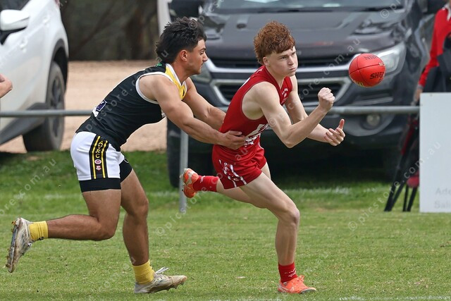 Hartley Bailley gets handball away as AJ Bergamin applies a tackle. (501838_01)