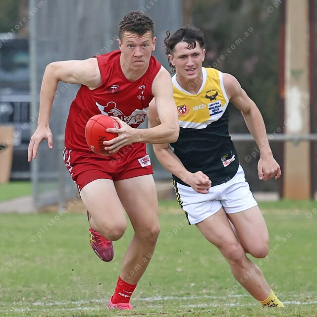 Rooster Michael Daly palms the footy Jared Brennan-style as Jaiden Karklis gives chase. (501838_05)