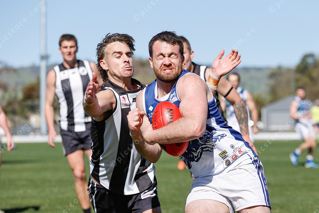 Angaston’s Russ Kuhn braces for the incoming tackle from Tomas Hahn. (501949_01)