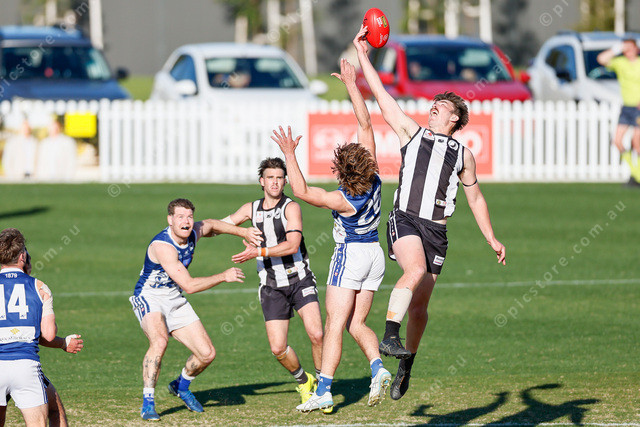 Todd Falkenberg uses his size and athleticism to easily win the hit-out above Angaston’s Corbin Schubert. (501949_04)